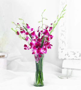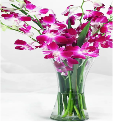 Flowers Colour of Flower: Assorted 6 Purple Orchids Green Dracaena Leaf Filler All Elegantly Arranged in a 9-inch Transparent Pipni Glass Vase